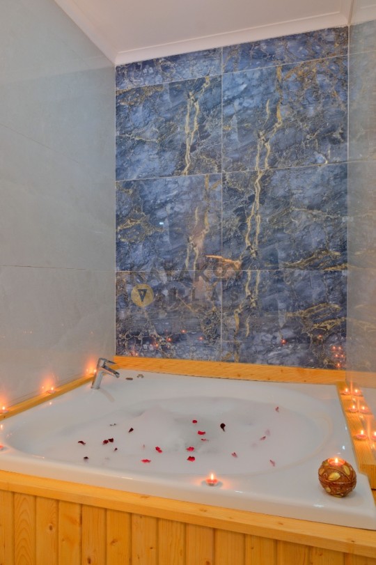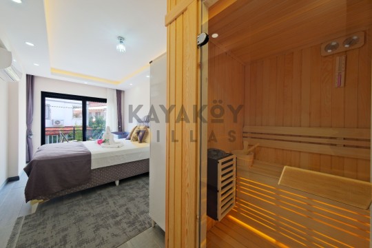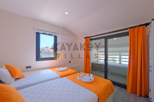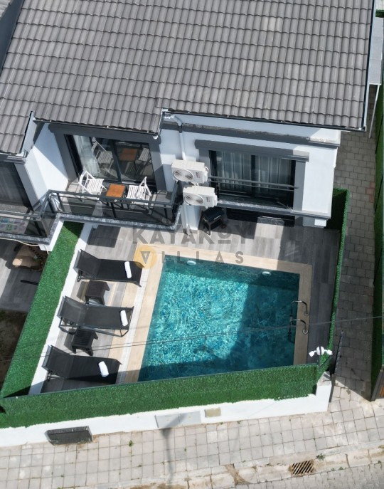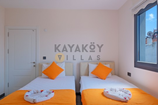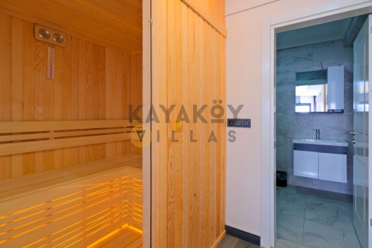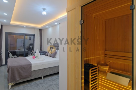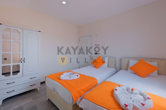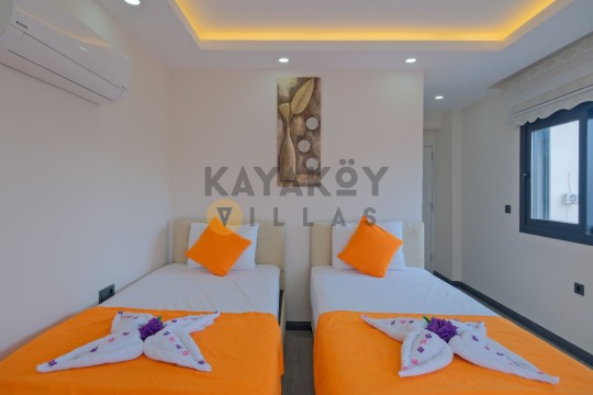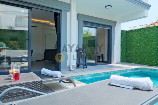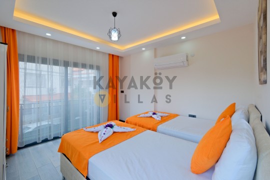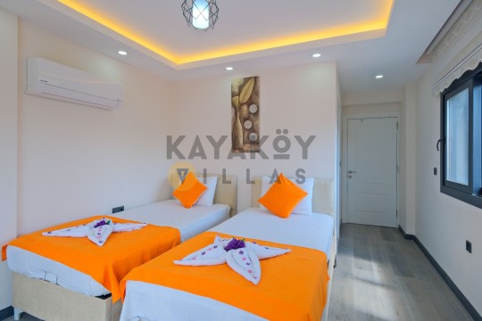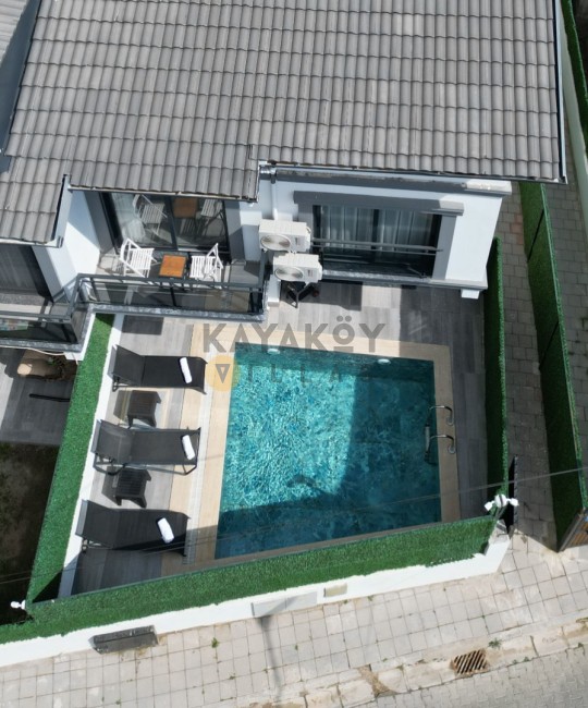 Geniş ve korunaklılığı güçlendirilmiş havuz terasında kapasiteye uygun şezlong takımı, oturma grubu ve barbekü alanı bulunan villanın, yine havuz terasına açılan konforlu oturma odası ve tam donanımlı açık mutfağı; iki yatak odasında da çift kişilik yatak, ebeveyn banyosu; diğer iki yatak odasında da iki tek kişilik yatak ve ebeveyn banyosu bulunmaktadır.