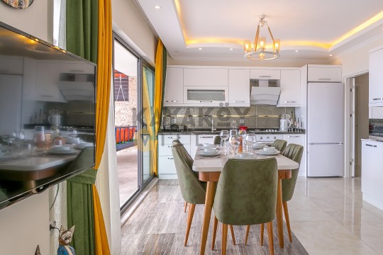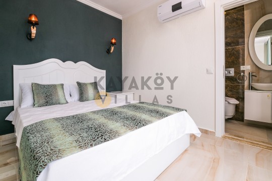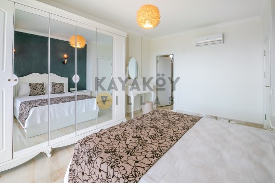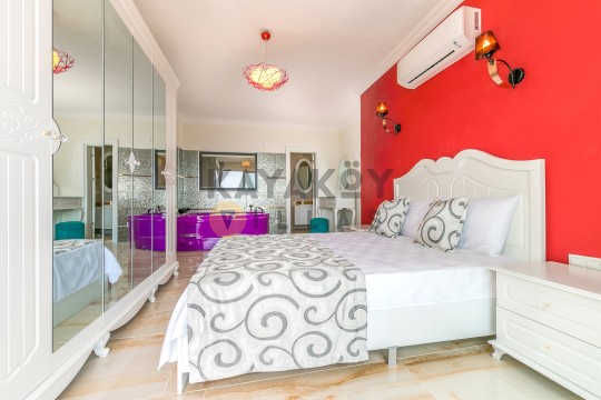 Villanın iç mekânında her biri klima ve ebeveyn banyolu 4 yatak odası yer alır; birinci yatak odası jakuzili ebeveyn banyosuyla ekstra konfor sağlar. Açık plan salon-mutfak alanı modern mobilyalarla döşenmiş olup TV, klima ve yemek masası gibi detaylarla tatil boyunca rahat bir yaşam alanı sunar. Tam donanımlı mutfakta mikrodalga, fırınlı ocak, bulaşık makinesi gibi ekipmanlar bulunur ve yemek hazırlığı tatil boyunca ev konforunu aratmaz.