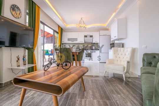 Ferah İç Mekân: Salon-mutfak, klima, TV ve havuz terasına doğrudan erişim.