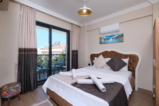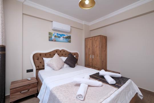 2. Yatak Odası : Oda içerisinde 1 adet çift kişilik yatak, komodin, kıyafet dolabı, makyaj masası, TV, klima, bulunmaktadır.