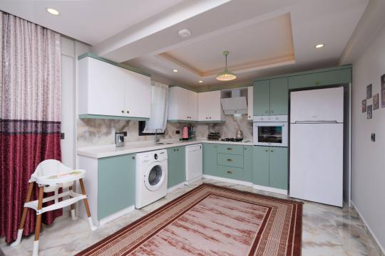 Mutfak : Modern Amerikan mutfak içerisinde buzdolabı, bulaşık makinesi, ankastre fırın, 4’lü ocak seti, su ısıtıcısı(kettle), mutfak gereçleri(tencere, tava, bardak, tabak vb.), yemek masası, mama sandalyesi ve havuz bölümüne direkt çıkış yer almaktadır.