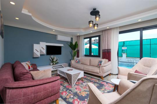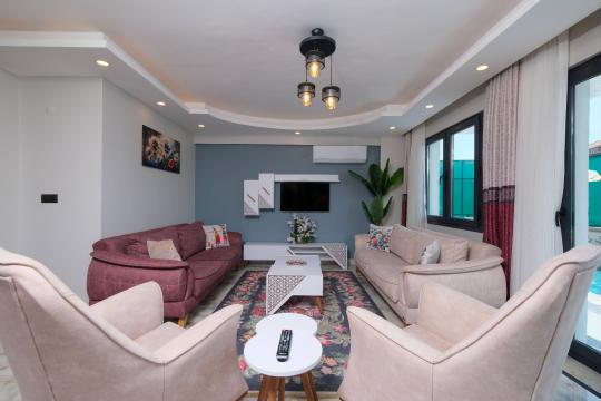 Salon : Lüks ve konforlu salon içerisinde oturma grubu, LCD TV, klima ve havuz terasına direkt çıkış yer almaktadır.