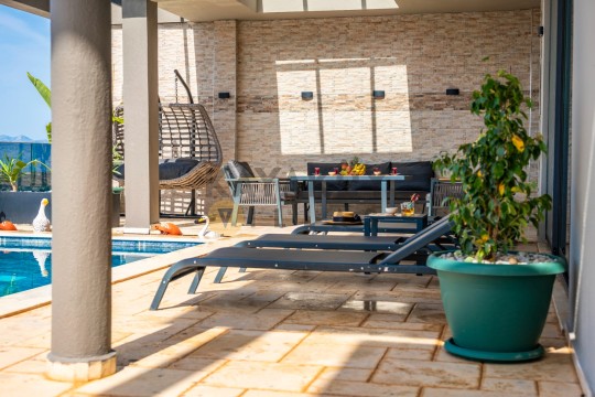 Villa Oliva’nın bahçesinde özel yüzme havuzu (yaklaşık 4,5 m × 3 m) ve çevresindeki şezlong alanı tatil boyunca güneşin ve doğanın keyfini çıkarmanız için tasarlanmıştır. Bahçede ayrıca barbekü/mangal ve dış mekân oturma grubu gibi donanımlar bulunur; bu da açık havada yemek ve sohbet deneyimini zenginleştirir.