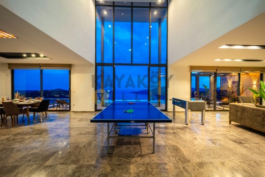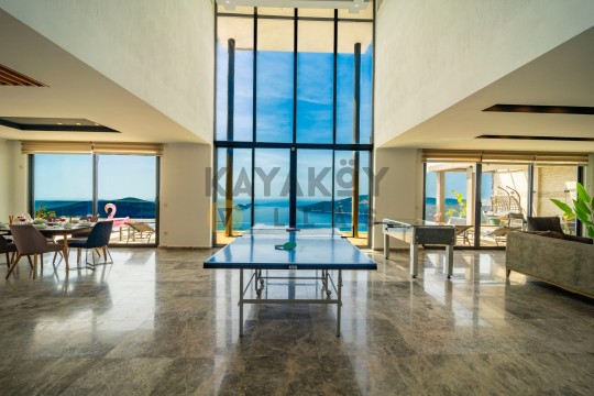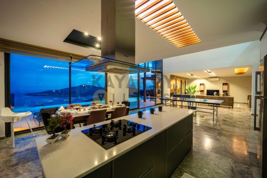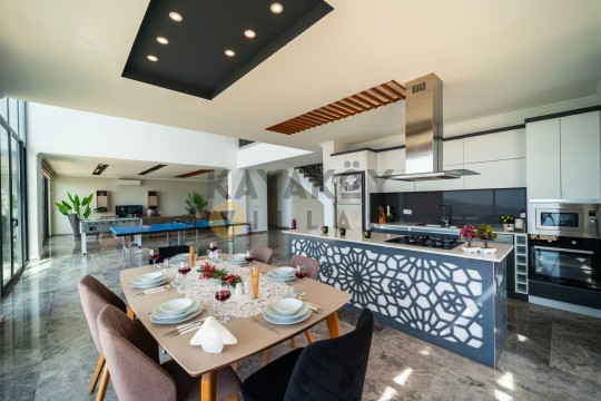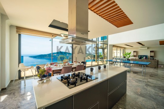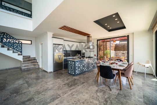 Açık plan salon ve mutfak alanı modern mobilyalarla döşenmiştir. Salon bölümünde klima, geniş oturma grubu, televizyon ve yemek masası bulunurken, mutfakta buzdolabı, mikrodalga fırın, ankastre ocak, bulaşık makinesi, çamaşır makinesi, tost makinesi ve temel pişirme ekipmanları gibi donanımlar yer alır. Salon doğrudan havuz terasına açılır ve tatil boyunca iç/dış mekân akışını kolaylaştırır.