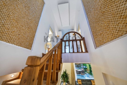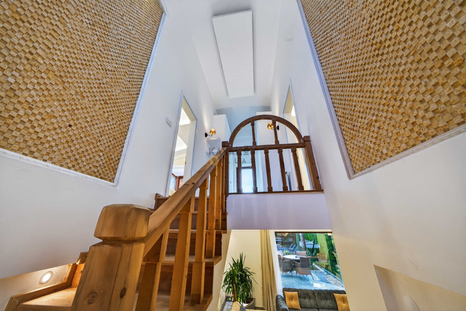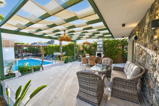 Geniş bahçesi taş ve ahşap mimarisiyle bezeli olan villa; şezlong, güneş şemsiyesi, barbekü ve oturma alanı gibi donatılarla çevrelenmiştir. Modern mutfak ve ferah salon sayesinde ev konforunda bir tatil deneyimi yaşarsınız.