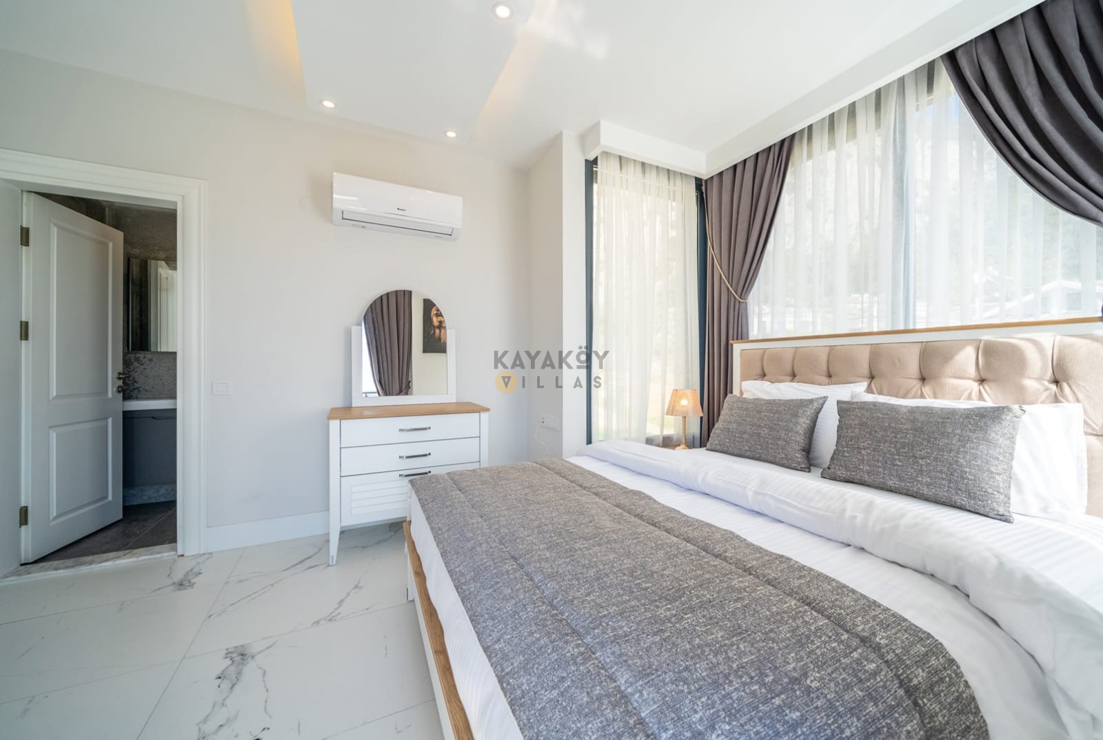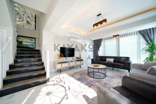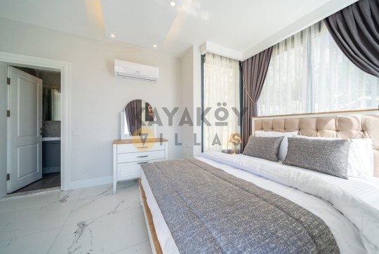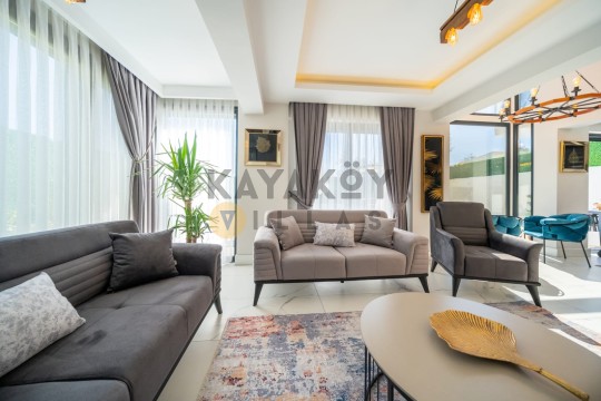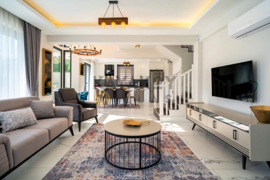 Villa KAranfil’in iç mekânı modern döşenmiş olup klimalı dört yatak odası, geniş oturma alanı ve donanımlı mutfak gibi yaşam alanları sunar. Salon bölümünde TV, oturma grubu ve havuz başına çıkış gibi detaylar bulunur; mutfak ise buzdolabı, çamaşır ve bulaşık makineleri, ocak-fırın gibi tam donanımlı ekipmanlarla donatılmıştır. Böylece tatil boyunca evinizdeki konforu aratmadan yemek hazırlayabilir ve yaşam alanını rahat şekilde kullanabilirsiniz.