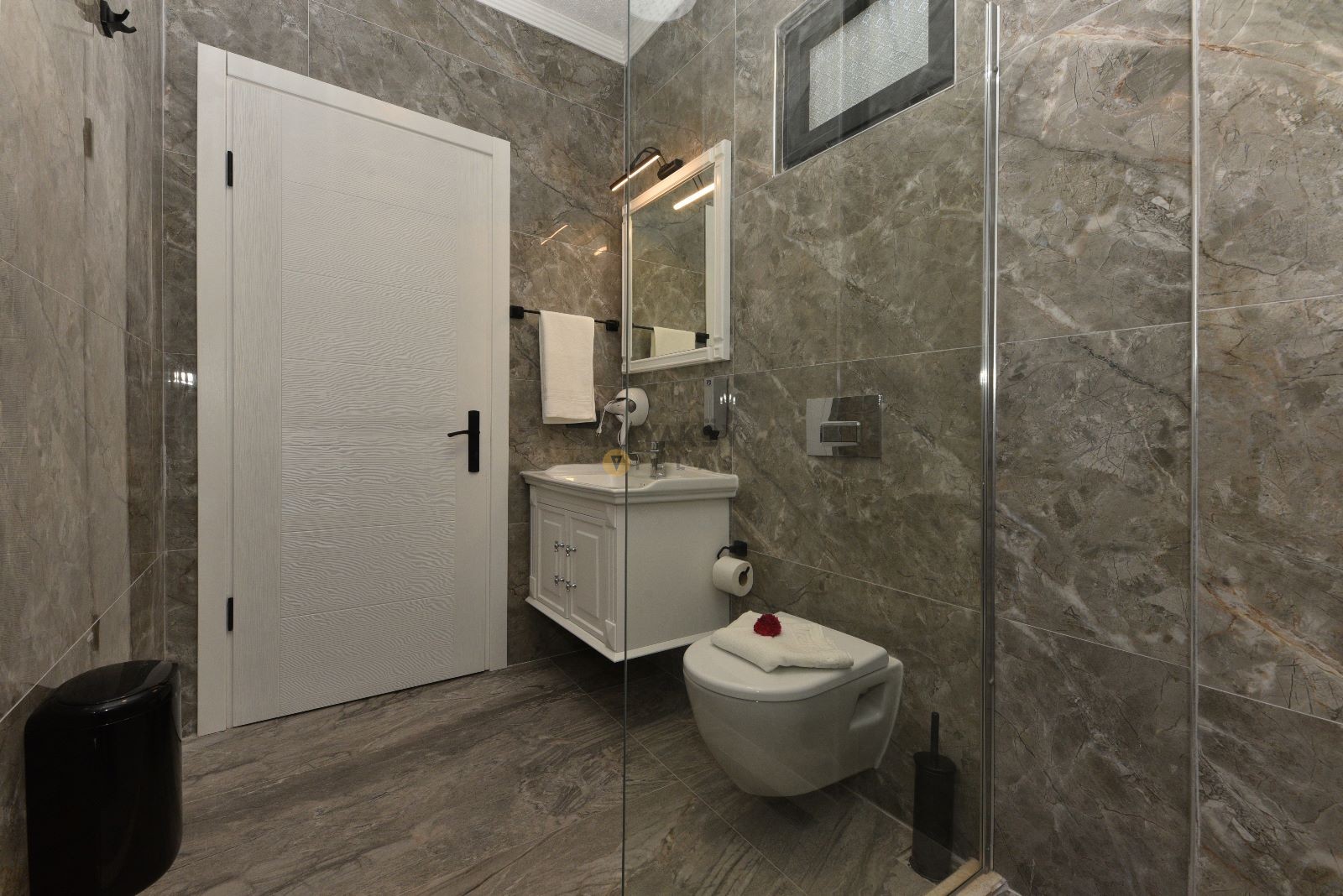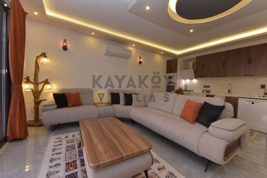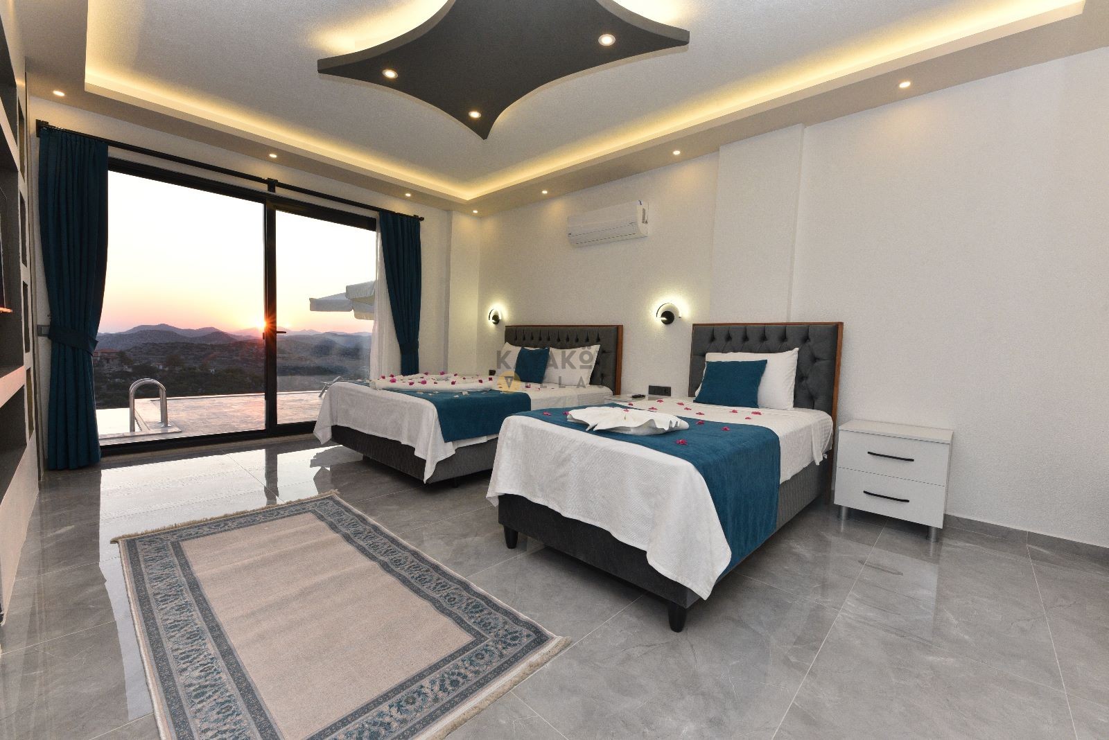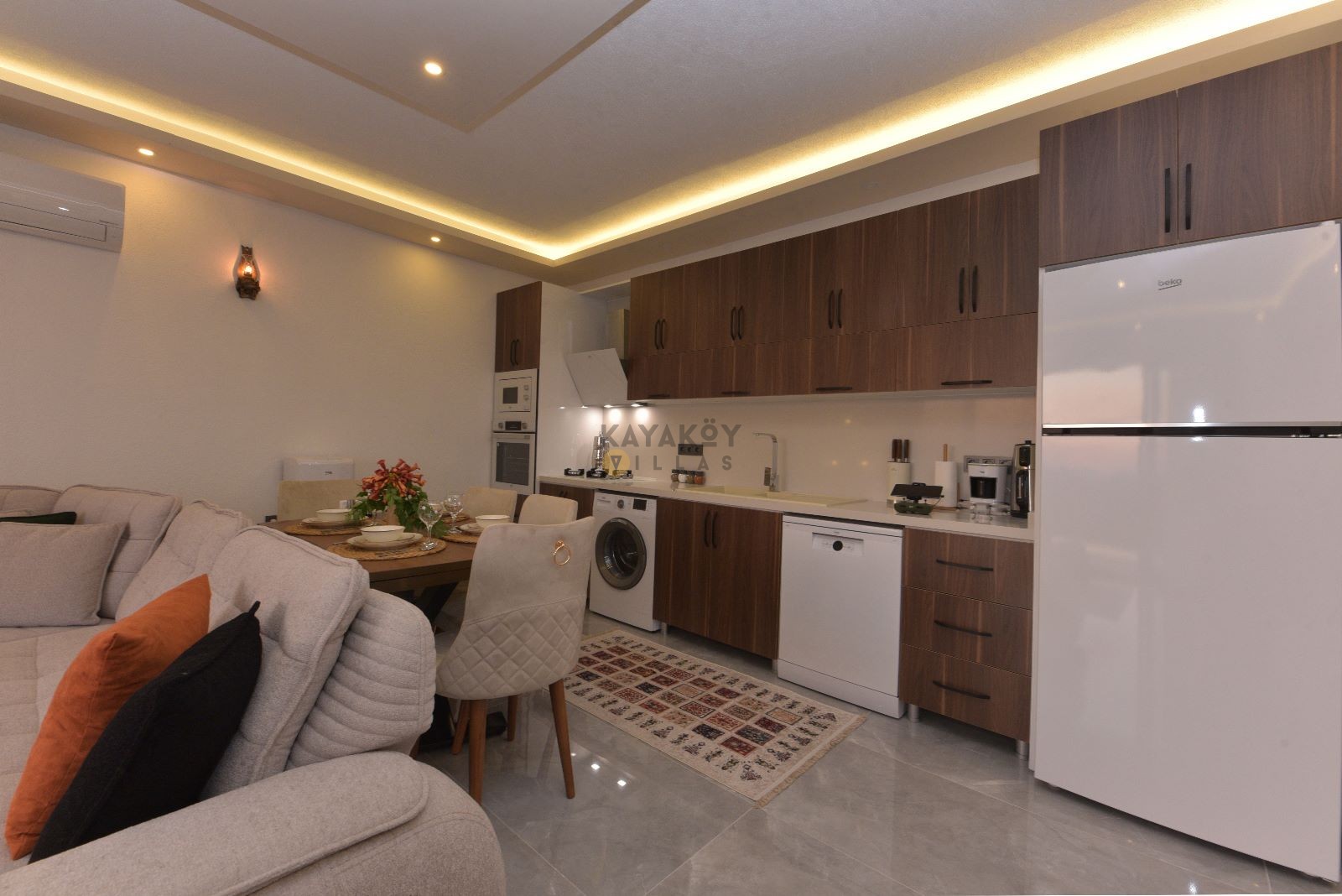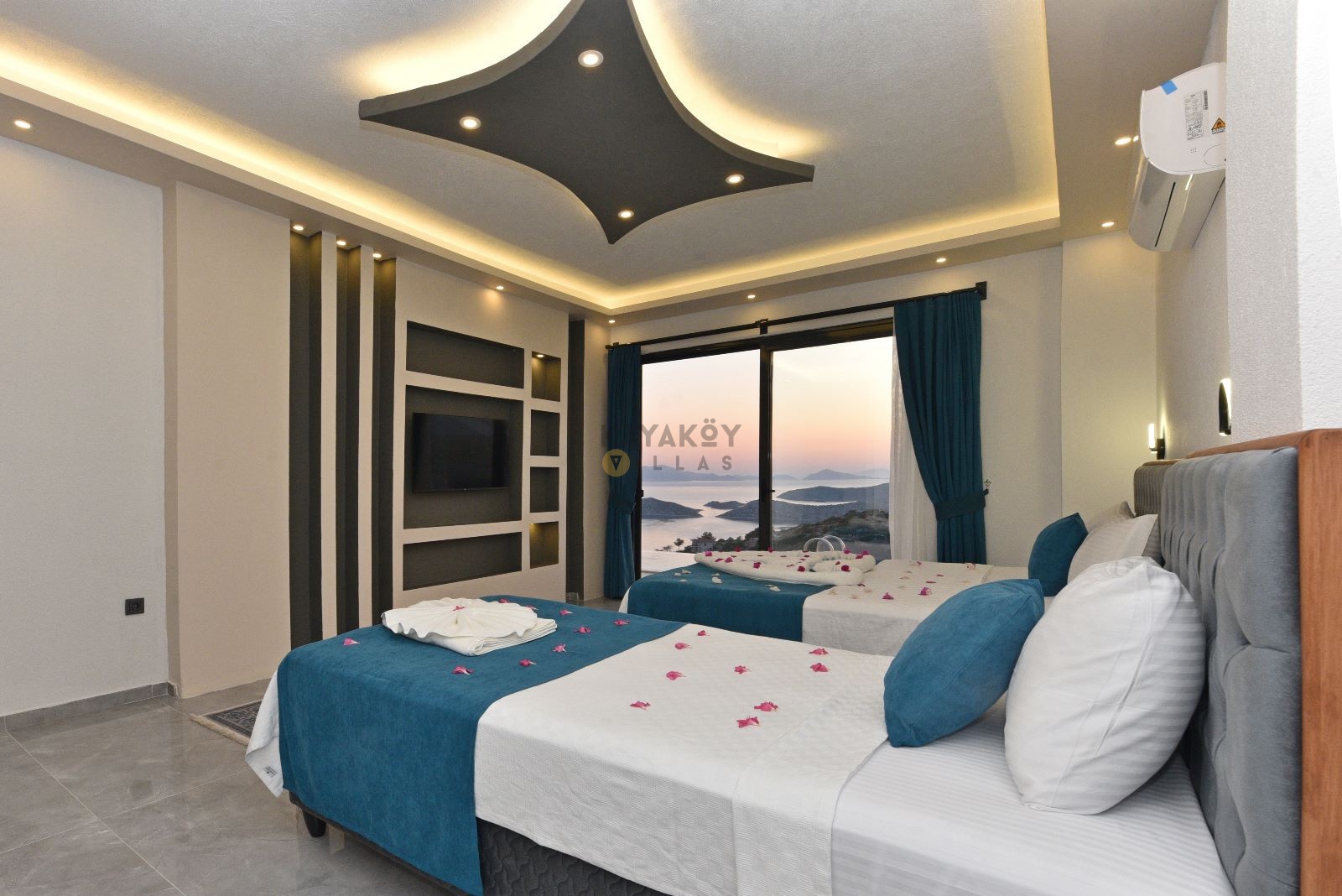 Villanın iç mekânı modern ve fonksiyonel bir düzen ile döşenmiştir. Birinci yatak odasında çift kişilik yatak, jakuzi, klima, TV ve özel banyo/WC bulunurken; ikinci yatak odasında çift kişilik yatak ve tek kişilik yatak, klima, TV ile banyo/WC mevcuttur. Açık plan salon alanı TV, uydu alıcı, oturma grubu, klima ve havuz terasına direkt çıkış gibi konfor detaylarıyla donatılmıştır. Modern Amerikan mutfakta buzdolabı, bulaşık makinesi, fırın, dörtlü ocak, elektrikli su ısıtıcısı ve temel mutfak gereçleri yer alır; böylece tatil boyunca ev konforunda yemek hazırlayabilirsiniz.