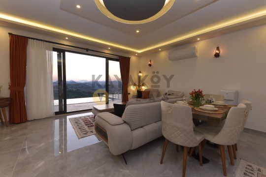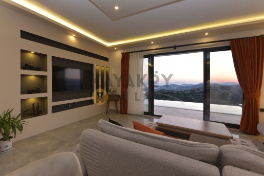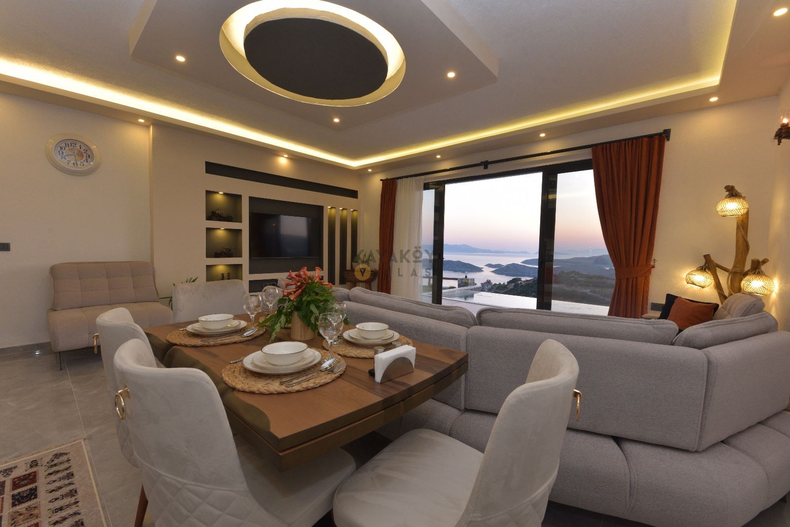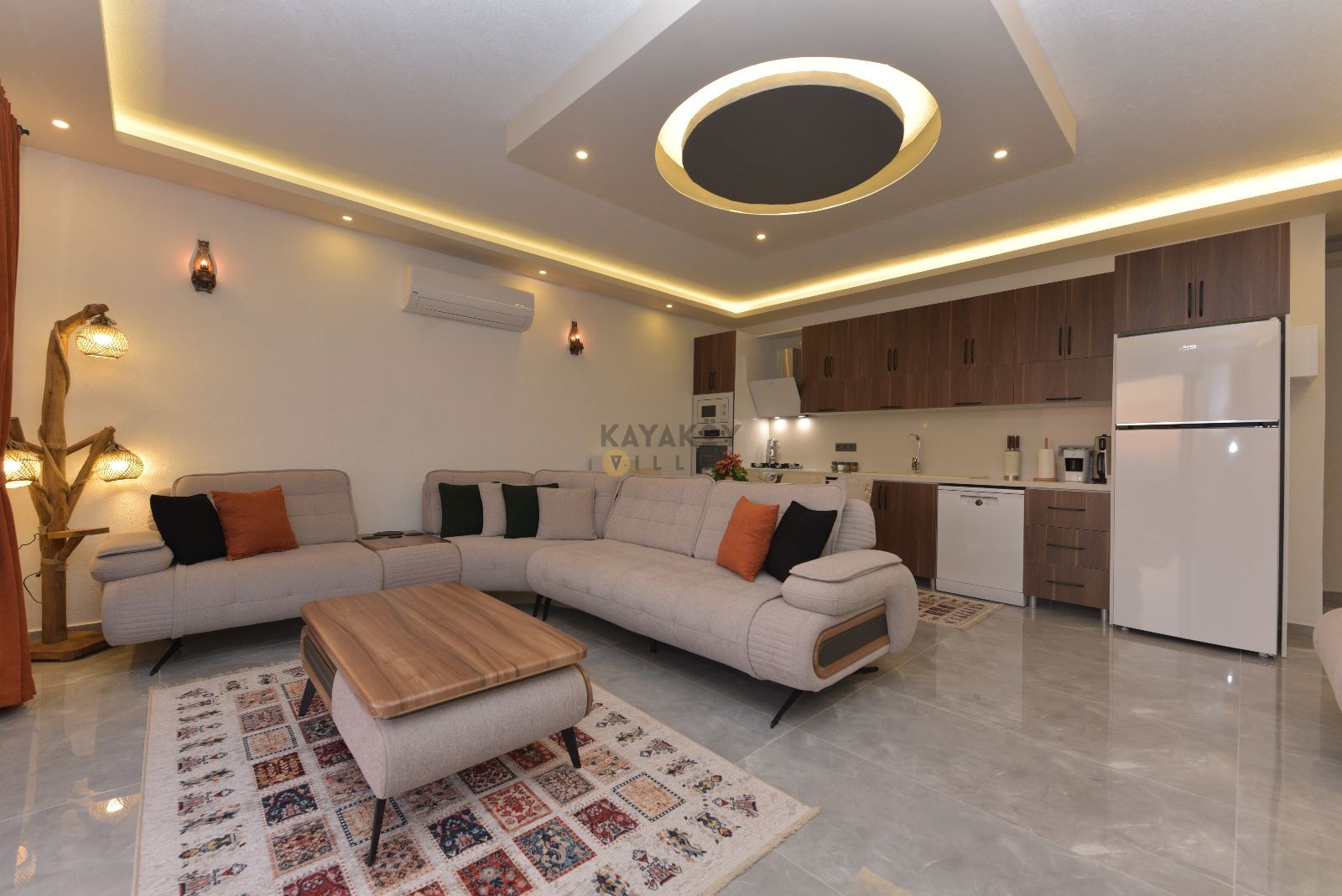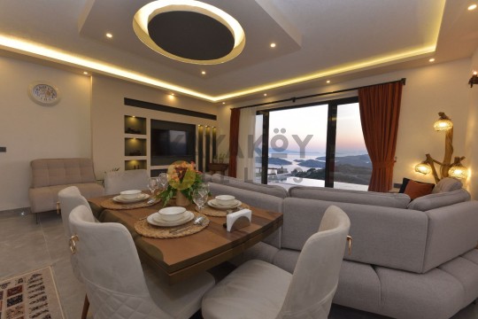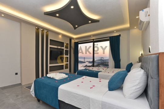 - Ferah Yaşam Alanı: Salon, TV, klima ve deniz manzaralı yaşam alanı.