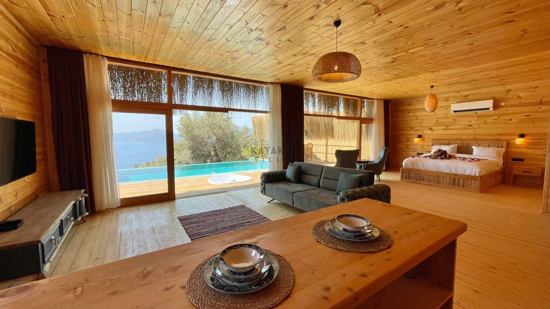 Palamut Faralya iç mekânı ferah yaşam alanı ile dikkat çeker; süitte akıllı TV, oturma grubu, mutfak ve buzdolabı gibi detaylar yer alır, bu sayede tatil boyunca hem dinlenme hem yemek hazırlama konforunu yaşayabilirsiniz. Havuz başında etrafı tüllerle çevrili dış yatak ve jakuzili oturma köşesi bulunur; bu alan, manzara eşliğinde dinlenmek, gün batımını izlemek veya romantik anlar geçirmek için idealdir. Havuz ısıtmalı olmasa da, jakuzide 7/24 sıcak su imkânı mevcuttur ve dilediğiniz gibi kullanılabilir.