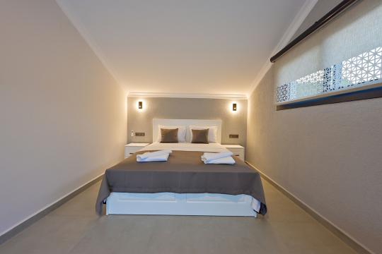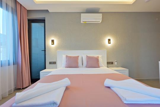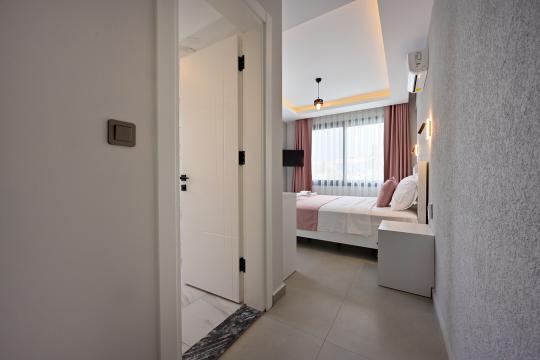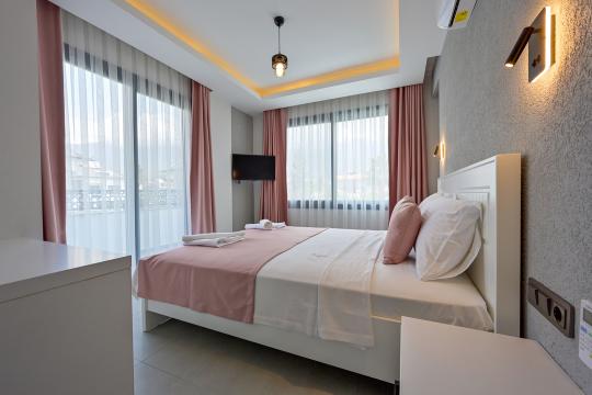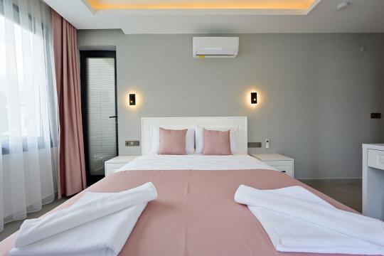 1. Yatak Odası : 1 Çift Kişilik Yatak + Klima + Komidin + Elbise Dolabı + Ebeveyn Banyo + TV