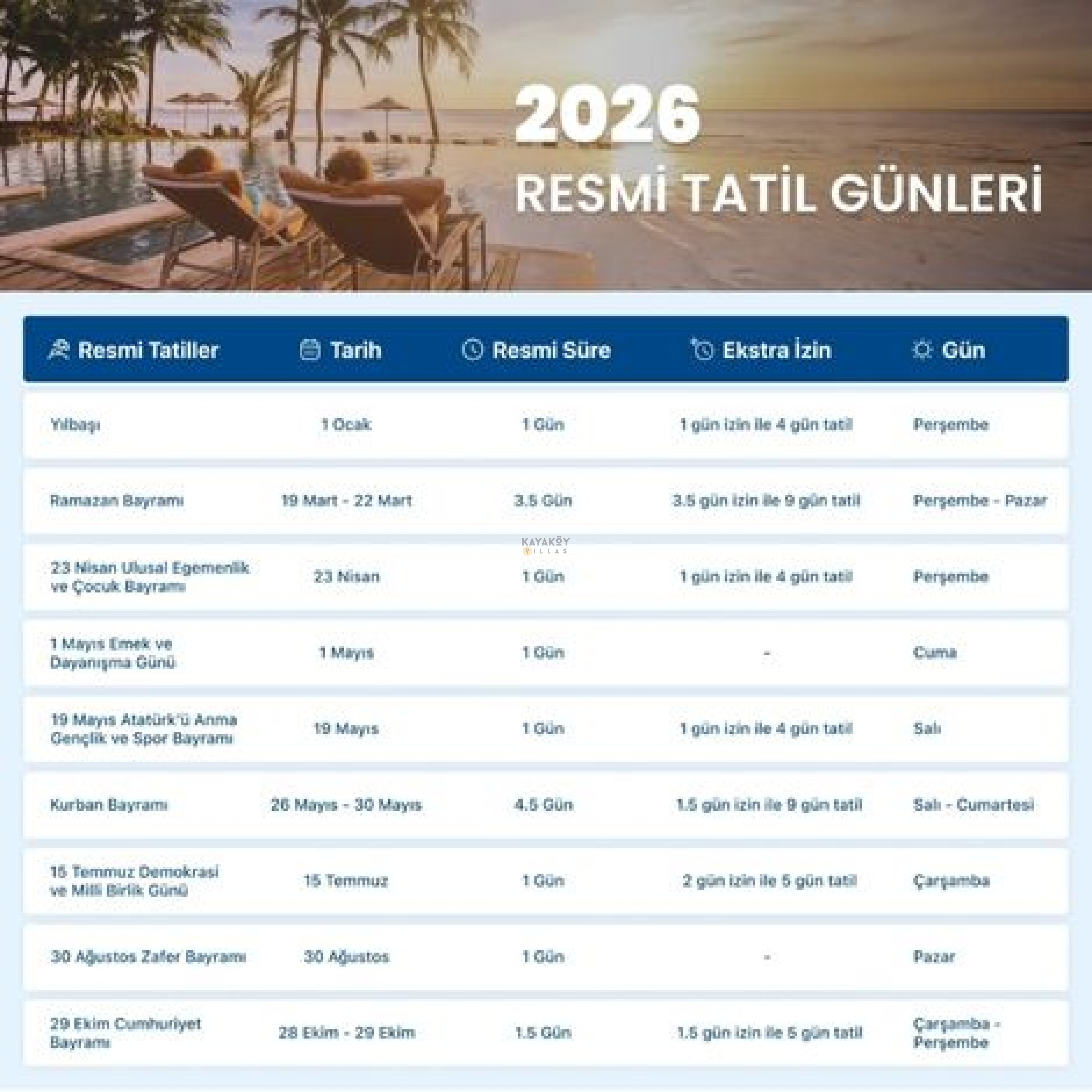 2026 yılında mayıs ayında bol bol tatil yapabileceksiniz. Cuma gününe denk gelen 1 Mayıs Emek ve Dayanışma Günü hafta sonu ile birleşiyor. Böylece 3 günlük bir tatil planlayabilirsiniz. Fethiye, Kaş, Kalkan bölgelerine gitmek ve villa seçeneklerimizi değerlendirmek için güzel bir program organize edebilirsiniz.