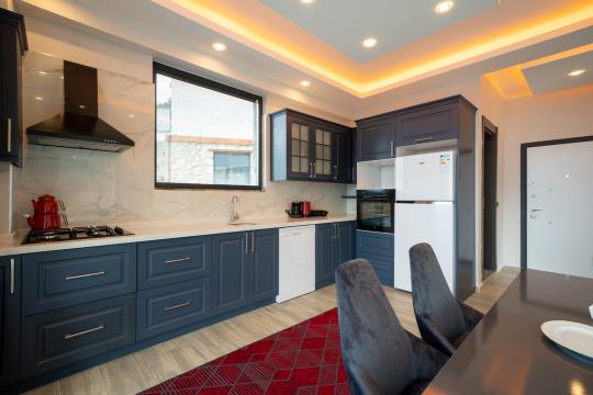 Mutfak : Havuz katında bulunan Amerikan mutfakta buzdolabı, bulaşık makinesi, çamaşır makinesi, yemek masası, fırın, 4’lü ocak, tost makinesi, kettle, yemek takımı, tava, tencereler ve çatal bıçak takımı bulunmaktadır.
