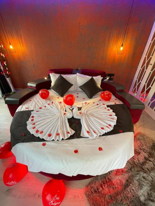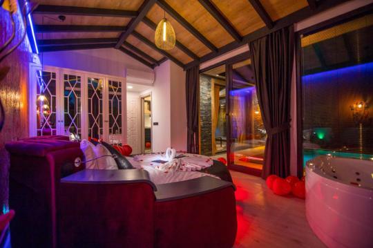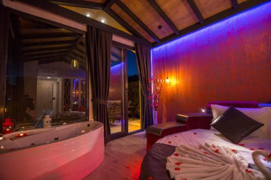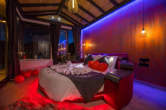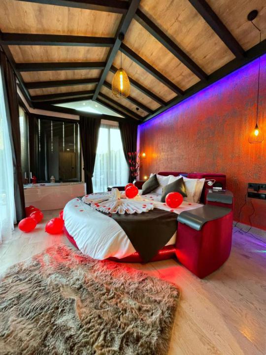 1. Yatak Odası : 1 adet çift kişilik yatak, makyaj masası, klima, elbise dolabı, komodin, Banyo&WC ve Jakuzi bulunmaktadır.