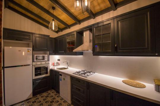 Mutfak : Havuz katında bulunan Amerikan mutfakta buzdolabı, bulaşık makinesi, çamaşır makinesi, yemek masası, fırın, 4’lü ocak, tost makinesi, kettle, yemek takımı, tava, tencereler ve çatal bıçak takımı bulunmaktadır.