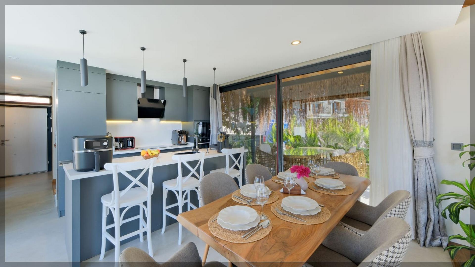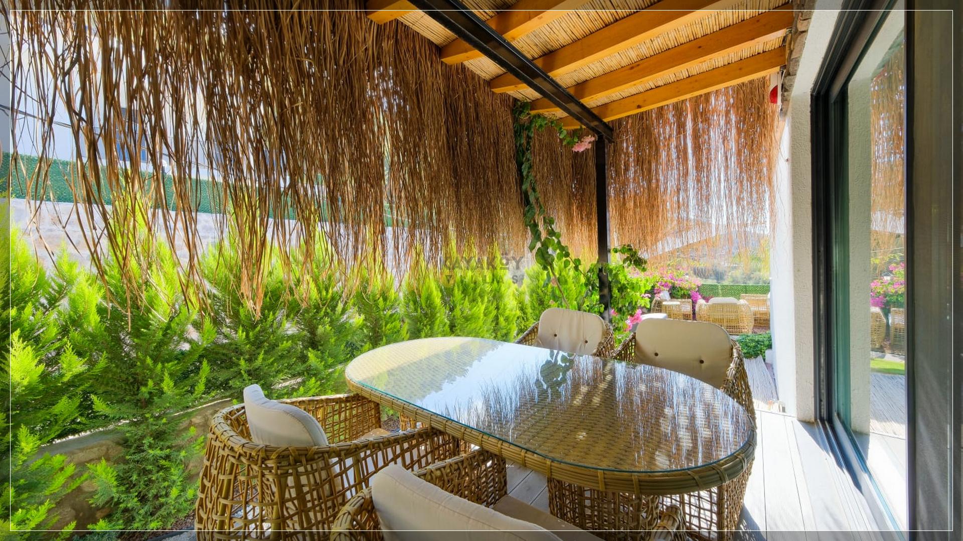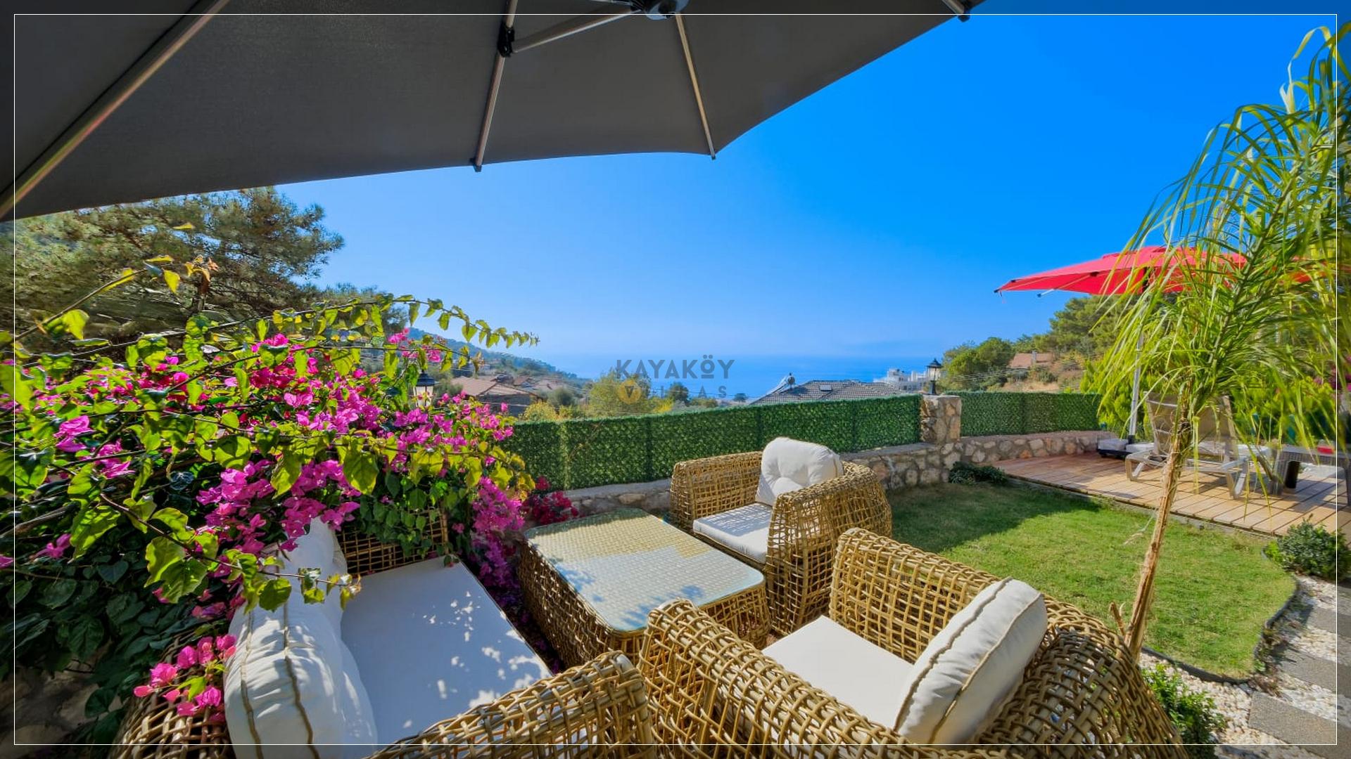 Bahçe : Özel yüzme havuzu bulunmaktadır. Damla salıncak ve güneşlenmeniz için şezlonglar bulunmaktadır. Özel dizayn edilmiş bir peyzaja sahiptir. Ayrıca bahçesinde bulunan barbeküsü ile deniz manzarası ile beraber akşam yemeklerinizin tadına varabilirsiniz.