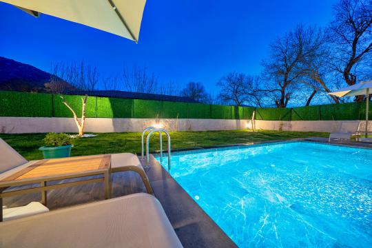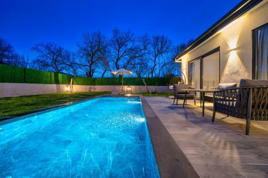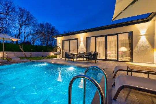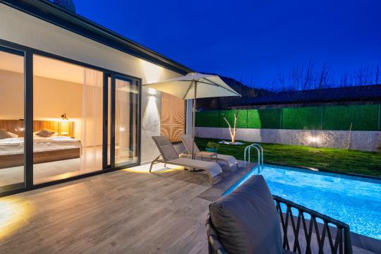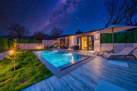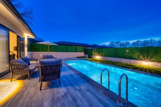 Villanın iç ve dış mekanı oldukça modern tasarlanmış olup havuz alanı korunaklıdır. Mahremiyetine önem veren misafirlerimiz için oldukça doğru bir tercihtir. Ebeveyn yatak odasında bulunan jakuzi ile doğa manzarası eşliğinde tüm yıl beklediğiniz keyfi yaşayabilirsiniz.