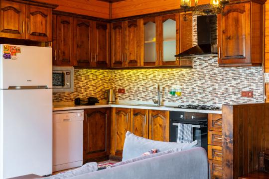 Mutfak : Havuz katında bulunan, doğa manzaralı modern Amerikan mutfakta buzdolabı, bulaşık makinesi, çamaşır makinesi, fırın, mikrodalga fırın, 4’lü ocak, elektrikli su ısıtıcısı(kettle), tost makinesi, 4 kişilik yemek takımı, tava, tencereler, kaşık çatal bıçak takımı vb. mevcuttur.