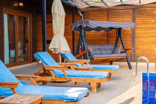 Salon : Oturma grubu, uydu alıcısı, modem, televizyon, klima, lavabo, ütü ve ütü masası bulunmaktadır. Havuz katında bulunan salondan havuz kenarına çıkış bulunur.
