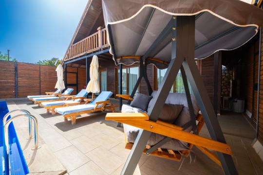 Özel Bahçe : Özel bahçede yüzme havuzu, bahçe oturma grubu, güneş şemsiyesi, şezlonglar, yemek masası, sandalyeler ve barbekü bulunmaktadır.