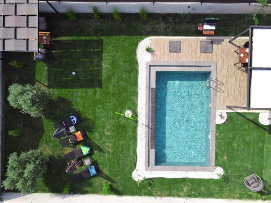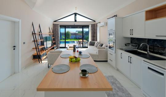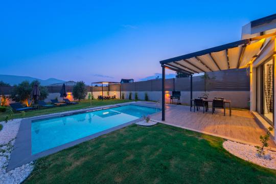 Merkezi konumu sayesinde tercihlerin başında gelen villa, oldukça ferah ve geniş bahçe alanında kapasiteye uygun şezlong takımı, oturma grubu, salıncak ve barbekü alanına sahiptir. Havuz terasına açılan zevkle döşenmiş konforlu oturma odası ve tam donanımlı mutfağı, bir yatak odasında çift kişilik yatak; ikinci yatak odasında da çift kişilik yatak bulunmaktadır. İç mekan yapısı ve donanımları da en az dış mekan kadar ferah, modern ve konforunuz ön planda tutularak oluşturulmuştur.
