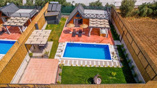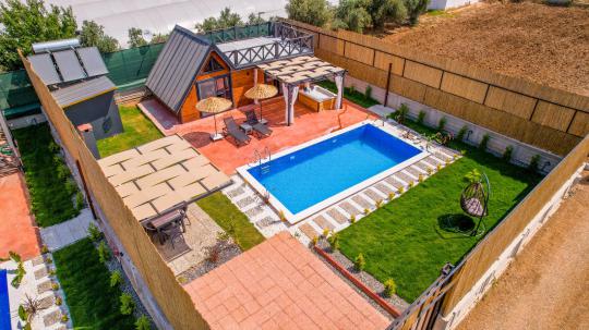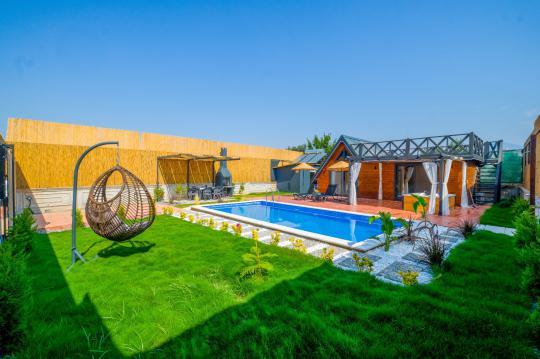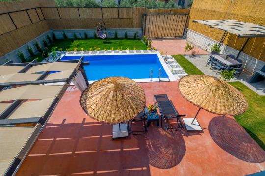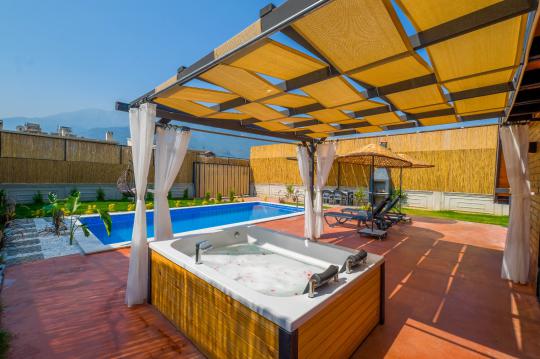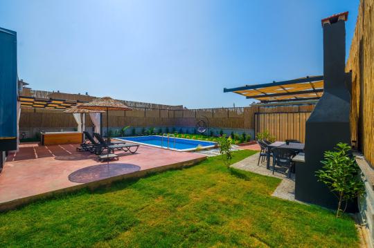 Özel yüzme havuzu, jakuzi, veranda, mangal alanı, şezlong, şemsiye, güneşlenme terası ve bahçe salıncağı bulunmaktadır.