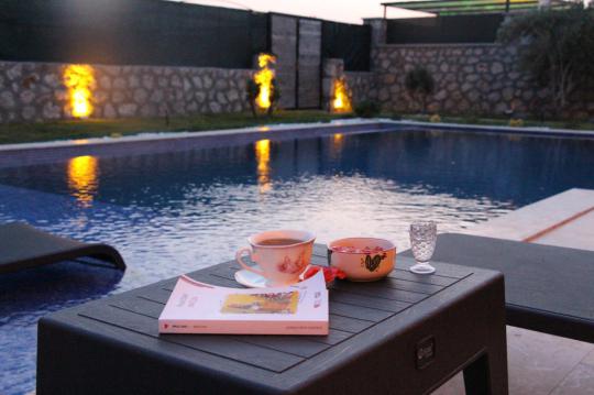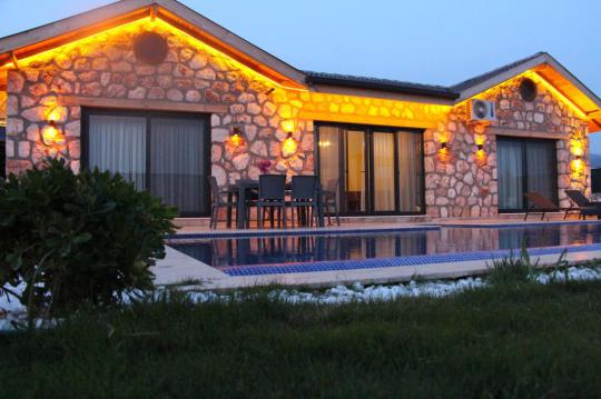 Salon: Açık mutfaklı salon, modern koltuklar, Lcd tv, uydu alıcısı ve klima bulunmaktadır. Salondan havuz ve bahçeye açılan kapısı mevcuttur.