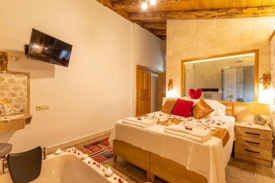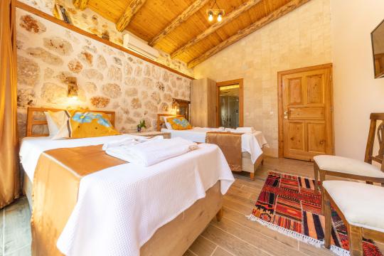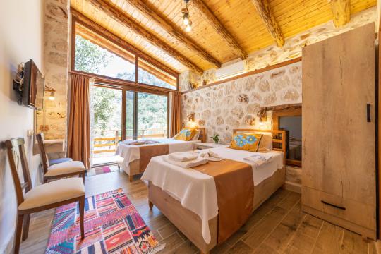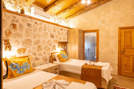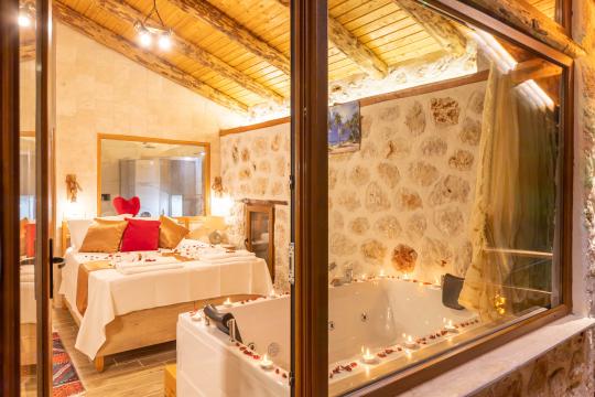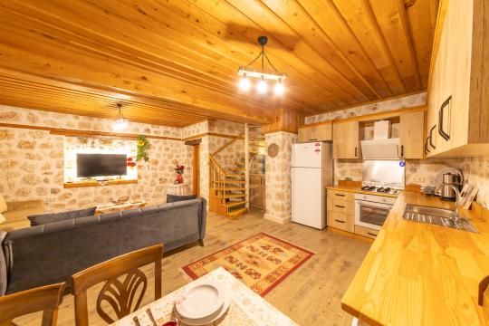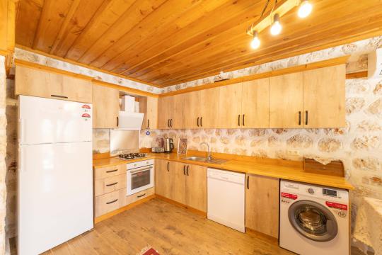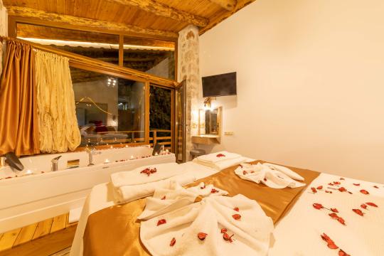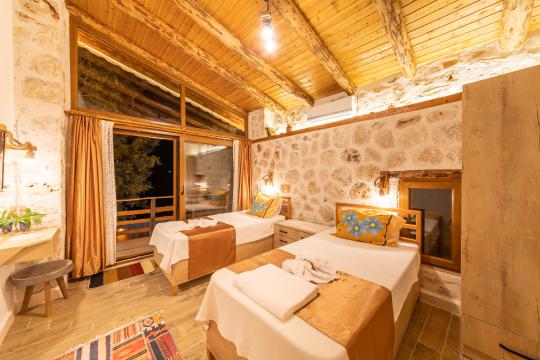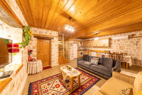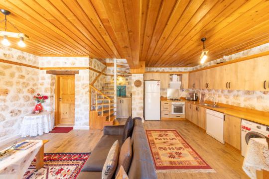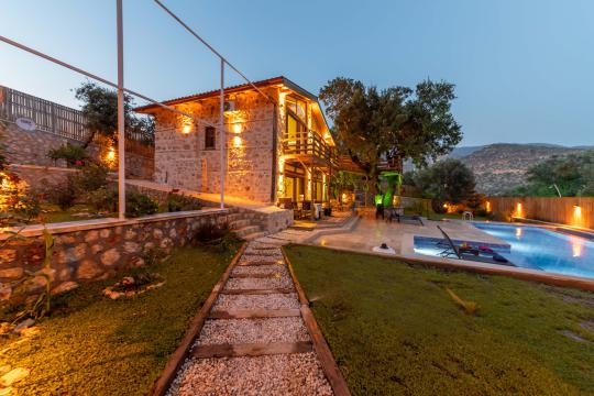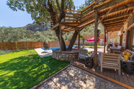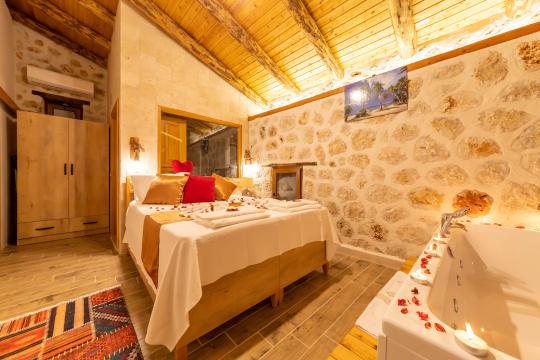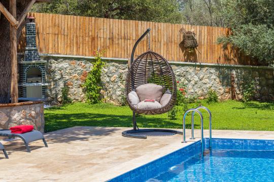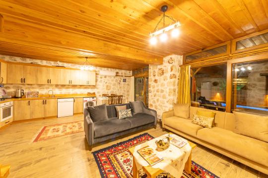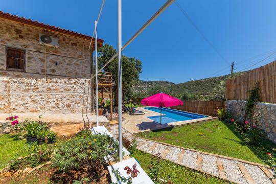 Ahşap ve taş mimariye sahip villa bünyesinde; kapasiteye uygun mobilyalar, ihtiyacınız olan tüm araç-gereçleri barındıran Amerikan tarzda, modern mutfak ve 2 adet yatak odası bulunmaktadır. Konforunuz odaklı tasarlanan villanın 2 yatak odasında da klima ve özel kullanım banyo/wc bulunmaktadır. Ebeveyn yatak odasında günün yorgunluğunu atmanızı ve tatilin keyfini çıkarmanızı sağlayacak 1 adet jakuzisi de mevcuttur. Korunaklı havuz terası ve müstakil bahçesinde şezlonglar ve şemsiyeler, oturma alanı, yemek masası, barbekü alanı ve salıncak bulunmaktadır.