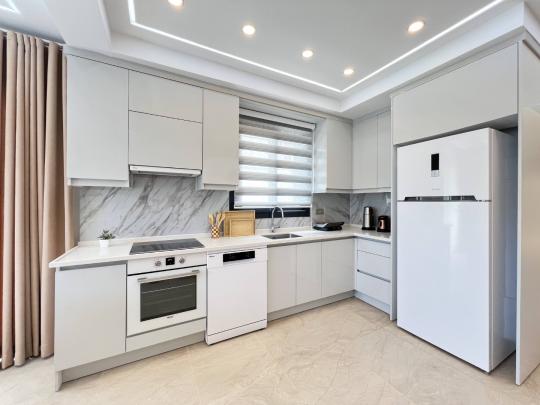 Mutfak : Tam donanımlı modern Amerikan mutfak içerisinde buzdolabı, bulaşık makinesi, fırın, ocak, tost makinası elektrikli su ısıtıcı, yemek masası, yemek takımları, çatal ve bıçak takımları, tencere ve tava takımları ve bardaklar bulunmaktadır.