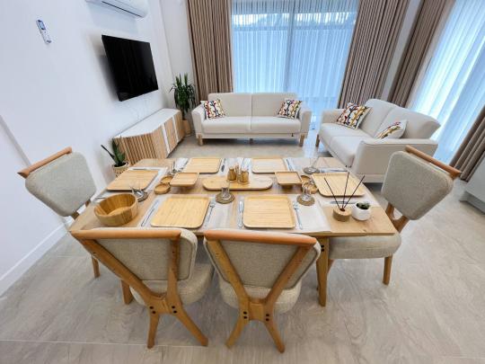 Mutfak : Tam donanımlı modern Amerikan mutfak içerisinde buzdolabı, bulaşık makinesi, fırın, ocak, tost makinası elektrikli su ısıtıcı, yemek masası, yemek takımları, çatal ve bıçak takımları, tencere ve tava takımları ve bardaklar bulunmaktadır.