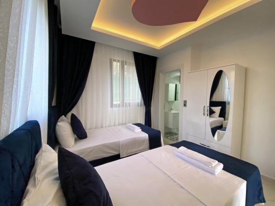 Villa Çağdaş birinci yatak odasında bir adet çift kişilik yatak, ebeveyn banyosu, jakuzi ve klima yer almaktadır. İkinci yatak odası içerisinde iki adet tek kişilik yatak, ebeveyn banyosu ve klima bulunmaktadır. Ortak alanda ise açık mutfak-salon, klima, WC ve TV yer almaktadır. Toplamda iki yatak odası ile beraber 4 kişi konaklama imkanı vermektedir.