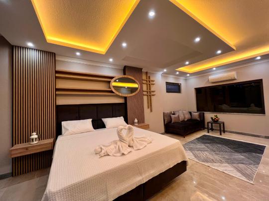 Detayları : Çift kişilik yatak, Makyaj masası, Komodin, Klima, Elbise dolabı, Banyo, Bebek yatağı bulunmaktadır.