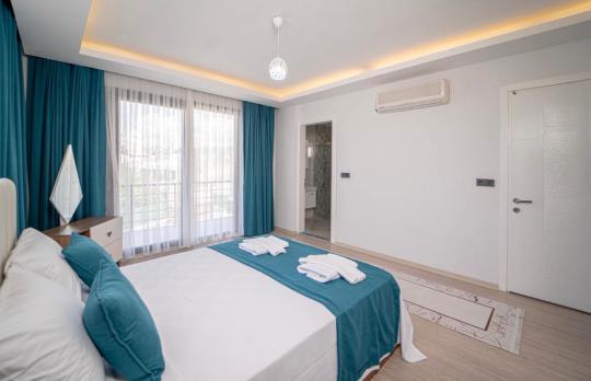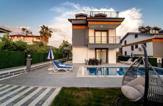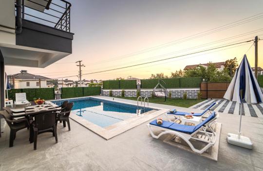 Havuz terasında kapasiteye uygun şezlong takımı, oturma grubu, barbekü; çocuk oyun alanı bulunan villanın iç mekanında ihtiyaçlarınıza karşılık verecek konforlu oturma odası, tam donanımlı açık mutfağı; ÜÇ yatak odasında çift kişilik yatak ve ebeveyn banyosu; iki yatak odasında ise iki tek kişilik yatak ve banyo bulunmaktadır.