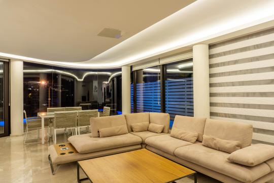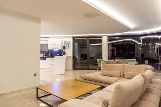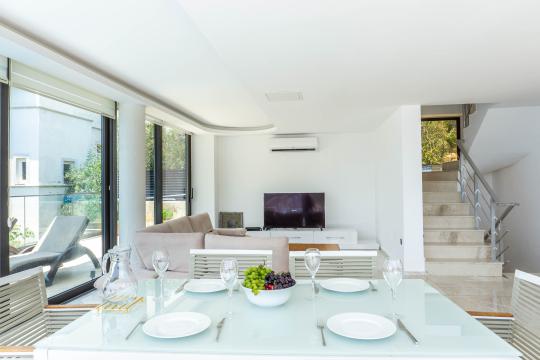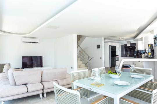 Salon: Deniz manzaralı salon içerisinde, L tarz koltuk takımı, orta sehpa, klima, TV, yemek masası yer almaktadır.
