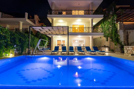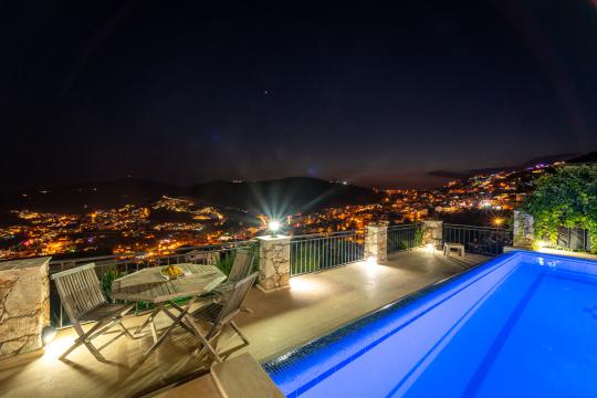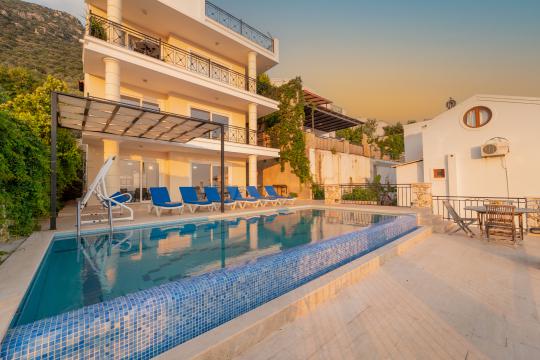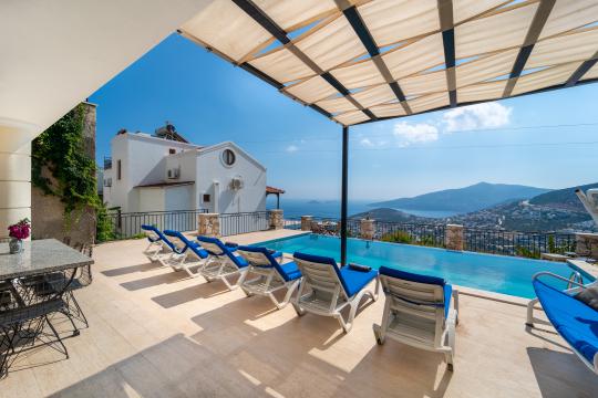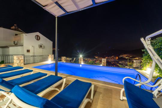 Daire Girit, Kalkan’da dört tane aynı mimarideki villanın yanyana yer aldığı bir site içerisinde bulunmaktadır. Konumundan dolayı panoramik bir deniz ve dağ manzarasına sahiptir. Bu manzara karşısında ayaklarınızı uzatabilir, şezlong ve şemsiyelerle donatılmış havuzunuzun başında dinlenerek huzurlu saatler geçirebilirsiniz.