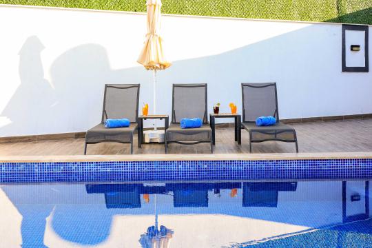 Villamızın havuz terası dışarıdan görünmez yapıdadır ve mahremiyet arayan misafirlerimiz için özenle tasarlanmıştır. Üstelik, manzaralı bir alanda yer alan 2 kişilik jakuzisi ile unutulmaz bir konaklama deneyimi sunar.