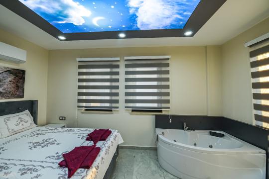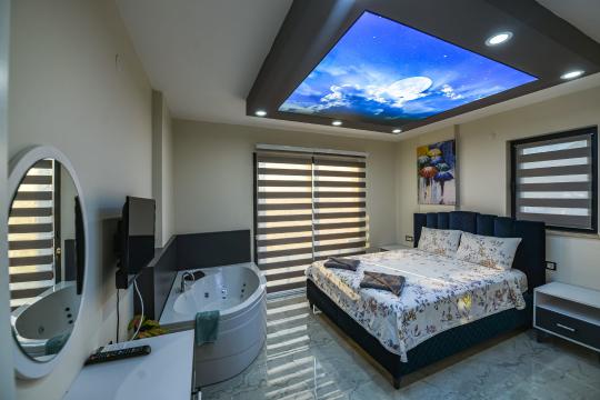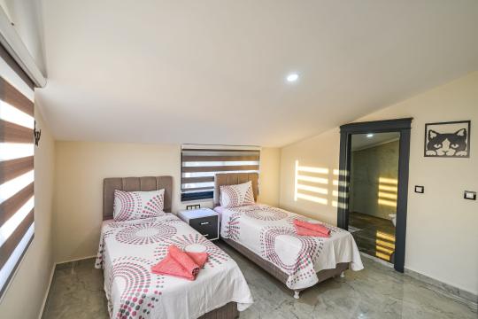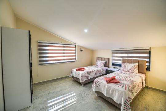 Toplamda 4 yatak odası bulunan villamızın 4 adet banyosu ve 2 adet ayrıca WC'si mevcuttur. Tüm yatak odalarında bulunan ebeveyn banyosu sayesinde misafirlerimiz rahatlıkla konaklayabileceklerdir. Villamızda zemin katında katında Türk hamamı, sauna, ısıtmalı iç havuz ve WC yer almaktadır. 1.katta ise açık mutfak-salon, televizyon, klima ve WC yer alırken, 2. katta birinci ve ikinci yatak odası yer alır. Birinci ve ikinci yatak odalarında birer adet çift kişilik yatak, klima, televizyon, WC-duş ve jakuzi bulunmaktadır. Çatı katında yer alan üçüncü ve dördüncü yatak odalarında ise ikişer adet tek kişilik yatak, klima ve WC-duş yer almaktadır.