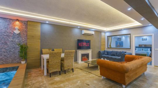 Doğa içerisinde konumlanan, taş bir mimariye sahip villa bünyesinde kapasiteye uygun mobilyalar, ihtiyacınız olan tüm araç-gereçleri barındıran Amerikan tarzda, modern mutfak ve 4 adet yatak odası mevcuttur. Konforunuz odaklı tasarlanan villanın tüm yatak odalarında klima ve özel kullanım banyo/wc bulunmaktadır.Villamız 4 katlı olup içerisinde dört yatak odası ve dört banyo bir WC bulunmaktadır. birinci yatak odasında bir adet çift kişilik yatak, klima,TV, banyo ve jakuzi ikinci yatak odasında ise iki adet tek kişilik yatak, klima ve banyo bulunmaktadır. Üçüncü yatak odasında bir adet çift kişilik yatak, klima,dördüncü yatak odasında bir adet çift kişilik yatak, klima ve banyo bulunmaktadır. İki salona sahip villamızın içerisinde ise mutfak, oturma grubu, klima, televizyon bulunmaktadır.