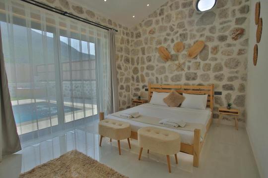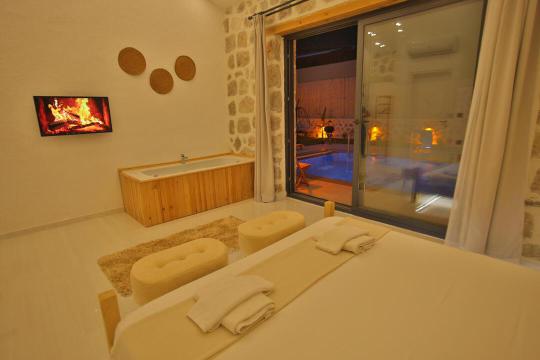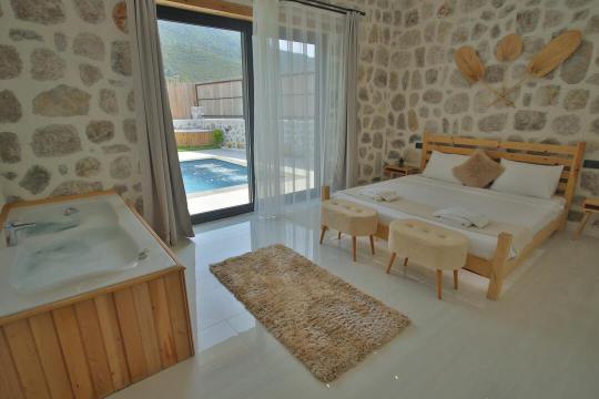 1. Yatak Odası : 1 adet çift kişilik yatak, komodin, elbise askılığı, klima, jakuzi, WC&banyo, havuz terasına çıkış bulunmaktadır.