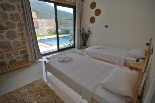 2. Yatak Odası : 2 adet tek kişilik yatak, komodin, elbise askılığı, klima, havuz terasına çıkış bulunmaktadır.