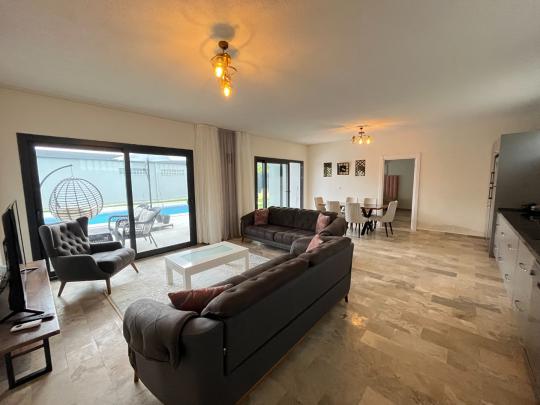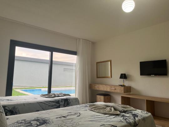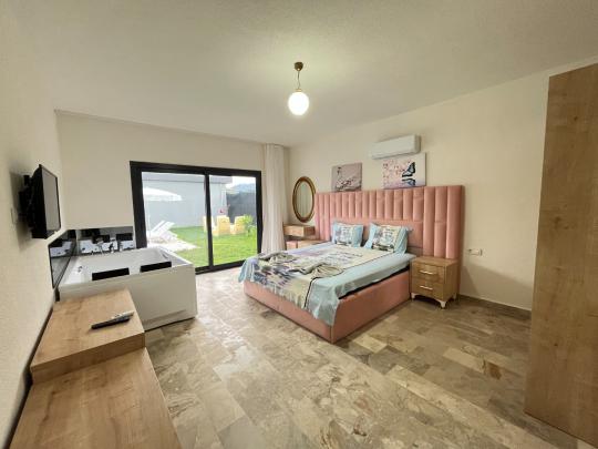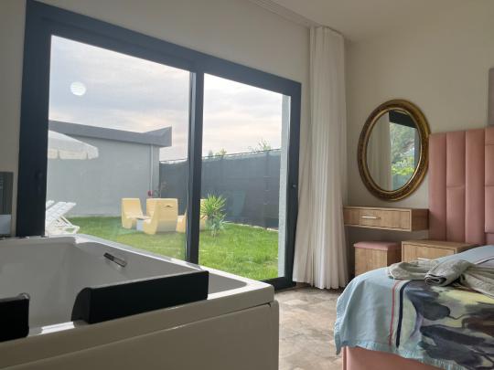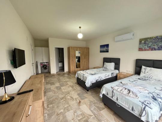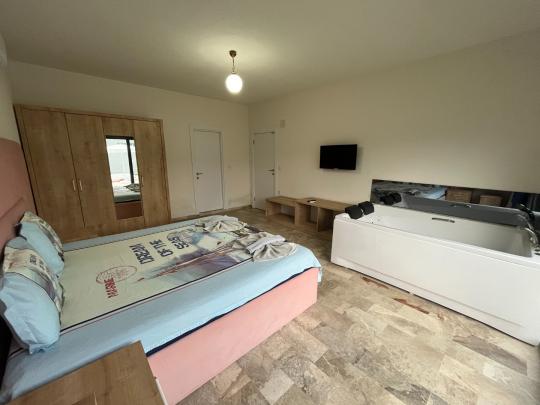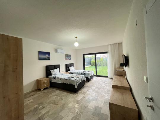 5 kişi kapasiteli villamızda toplamda 2 adet yatak odası ve 2 adet banyo yer almaktadır. Birinci yatak odası içerisinde bir adet çift kişilik yatak, ebeveyn banyosu, klima, TV ve jakuzi; ikinci yatak odası içerisinde ise iki adet tek kişilik yatak, WC-banyo, TV ve klima bulunmaktadır. Ortak kullanım salonda da oturma grubu, klima ve televizyon mevcuttur. Ayrıca salonda 1 kişilik yatma imkanı mevcuttur, bu sayede villamız 5 kişi kapasiteli olmaktadır.