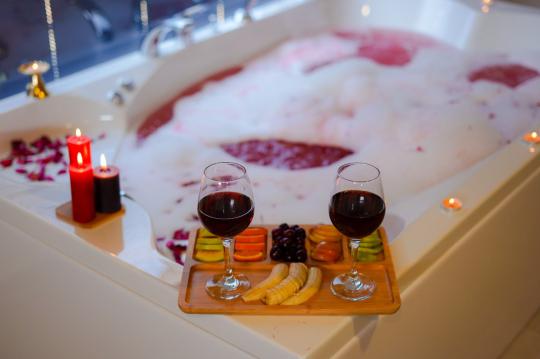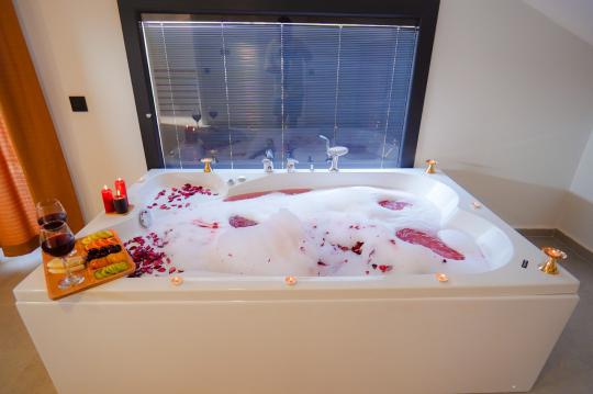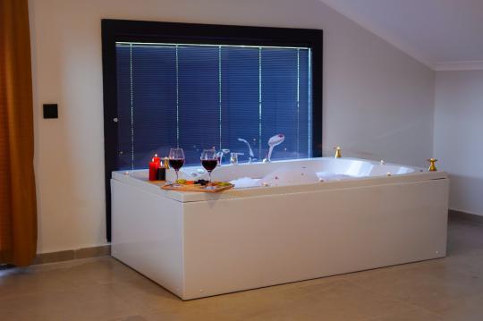 1. Yatak Odası:1 adet çift kişilik yatak, bebek yatağı, Jakuzi, makyaj masası, elbise dolabı, komidin, klima, banyo/WC