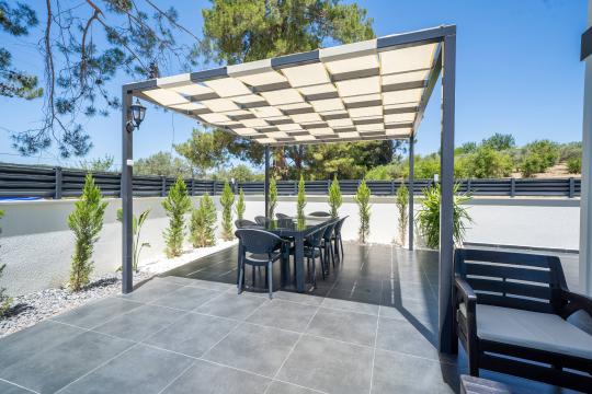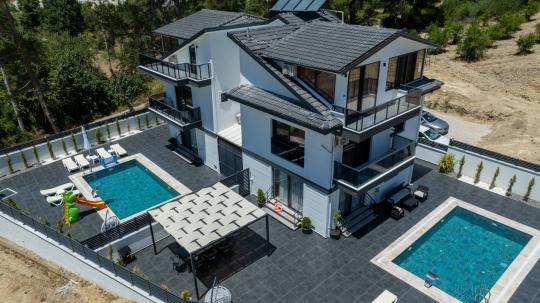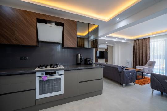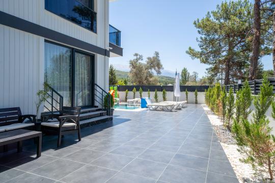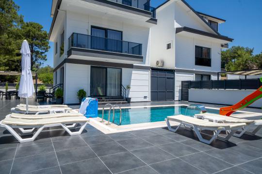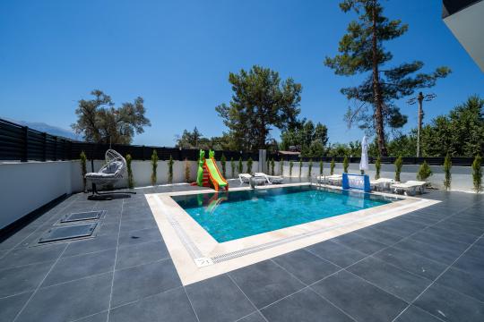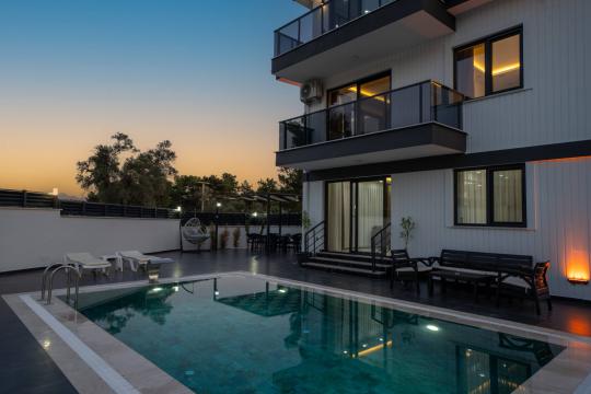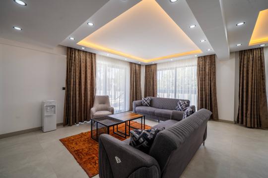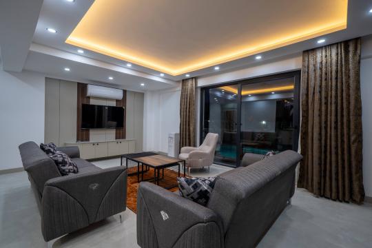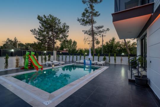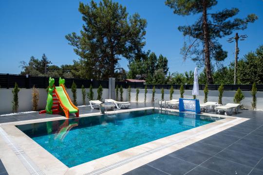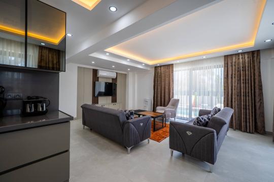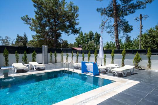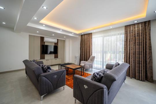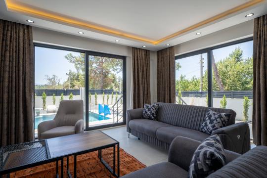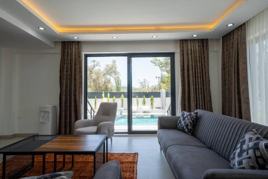 Salon: Özenle döşenmiş açık mutfaklı salon, klima, modern koltuklar, 6 kişilik yemek masası, Led tv, uydu alıcısı, havuz ve bahçeye açılan kapısı bulunmaktadır.