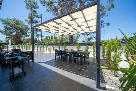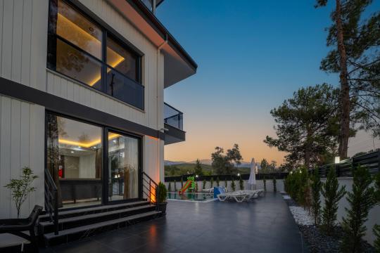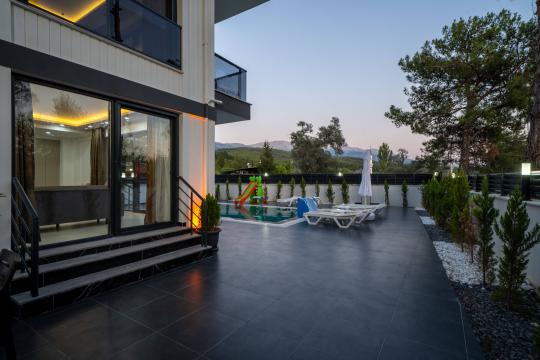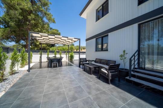 Dış özellikler; Özel yüzme havuzu, şezlong, şemsiye, bahçe mobilyaları, güneşlenme terası, kamelya, bahçe salıncağı ve çocuk oyun alanı bulunmaktadır.