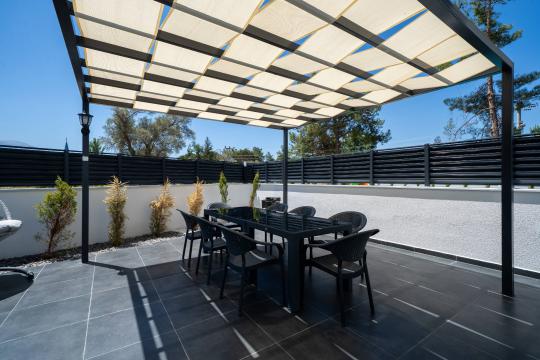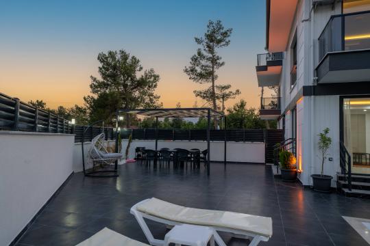 Dış özellikler; Özel yüzme havuzu, şezlong, şemsiye, bahçe mobilyaları, güneşlenme terası, kamelya, bahçe salıncağı ve çocuk oyun alanı bulunmaktadır.