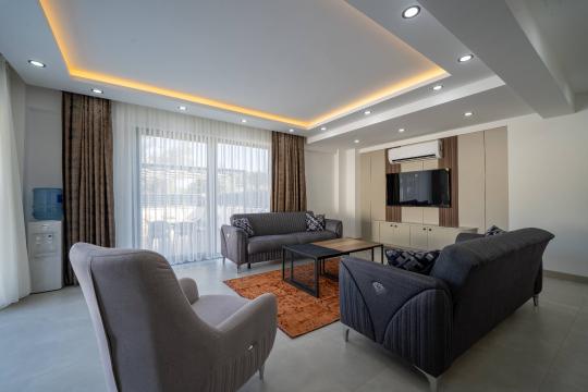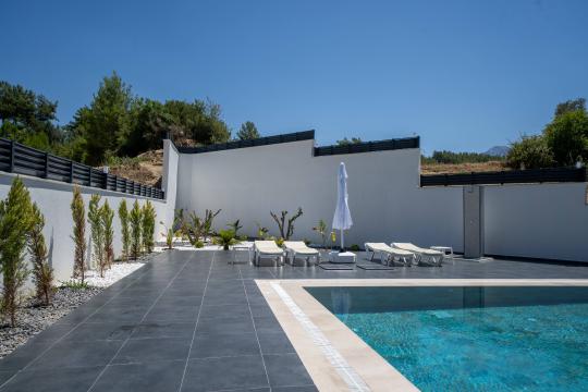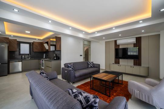 Salon: Özenle döşenmiş açık mutfaklı salon, klima, modern koltuklar, 6 kişilik yemek masası, Led tv, uydu alıcısı, havuz ve bahçeye açılan kapısı bulunmaktadır.
