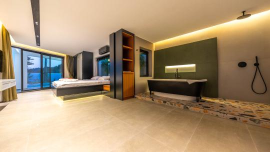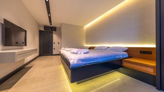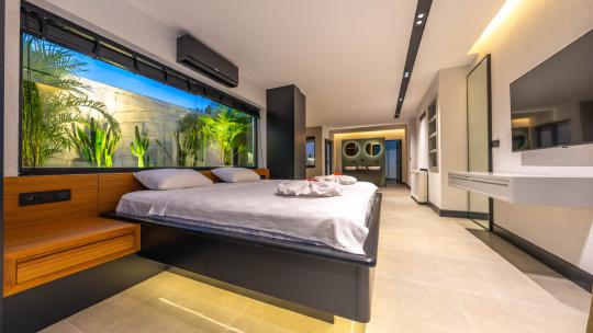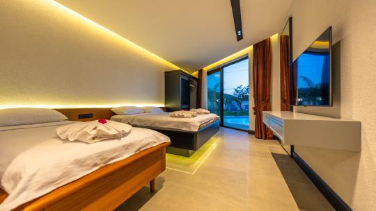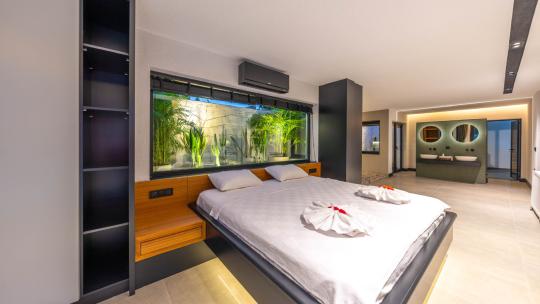 1. Yatak Odası : 1 adet çift kişilik yatak,makyaj masası, klima, LCD TV, küvet, elbise dolabı, komodin,bebek beşiği, banyo, WC ve havuz terasına çıkış bulunmaktadır.