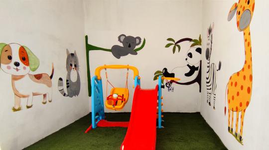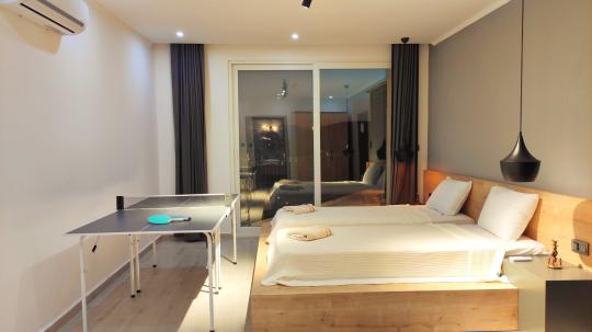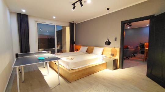 Çocuk odasında pinpon masası aktivitesi bulunmaktadır. Bu odadaki yatak aparatı ortaya konularak hem iki kişi hem de aparat çıkarılarak maksi boy yatak çift kişilik yatak şekline getirilebilir.
