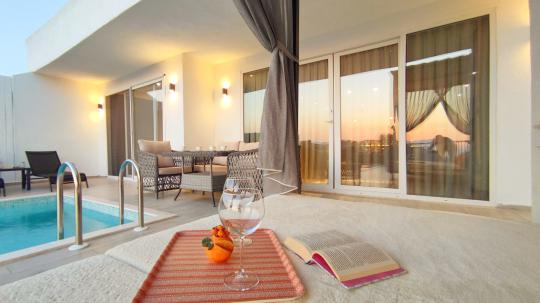 Havuzu Infinity havuzudur. Denize doğru dik bir şekilde inşa edilen havuzu özellikle denize yüzüyormuş hissi vermektedir.