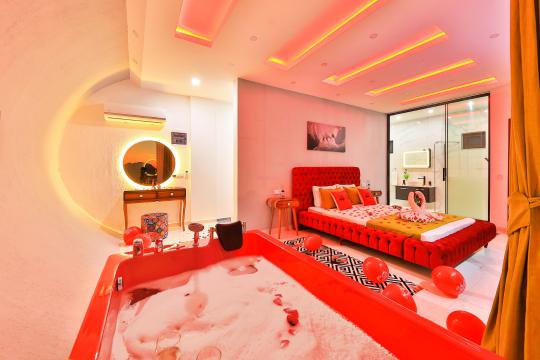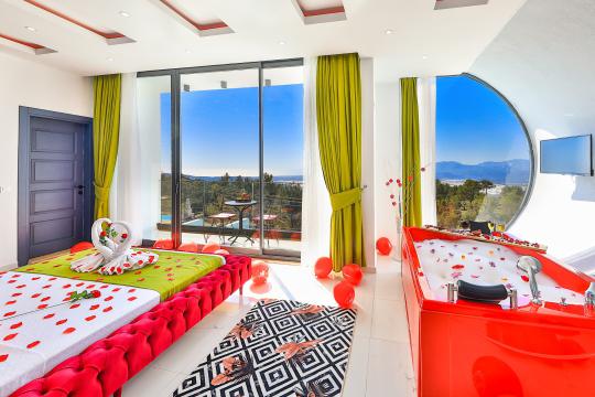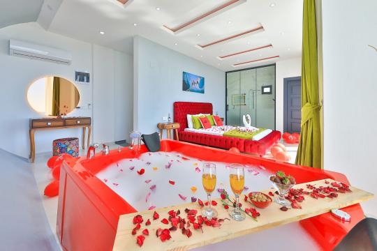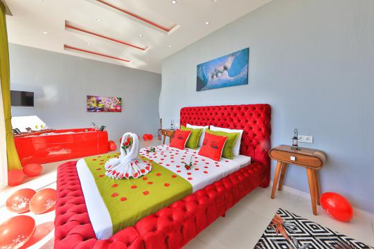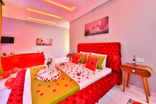1. Yatak Odası: 1 adet çift kişilik yatak, komodin, makyaj masası, elbise dolabı, aynalı makyaj masası, klima, jakuzi, LCD TV , WC&banyo bulunmaktadır.