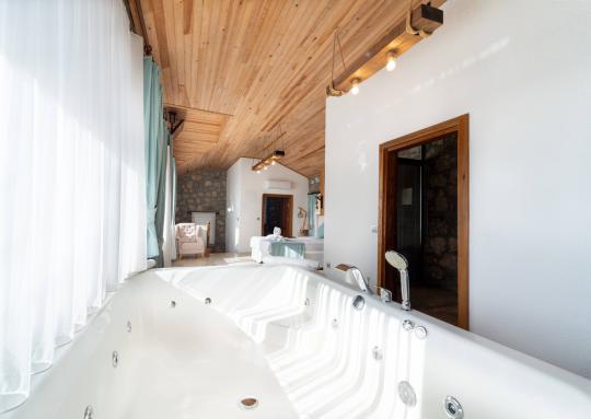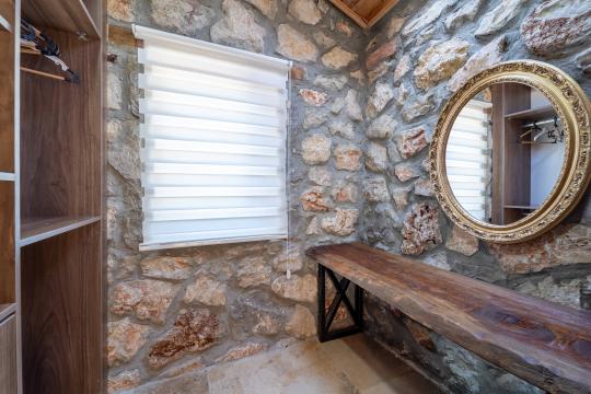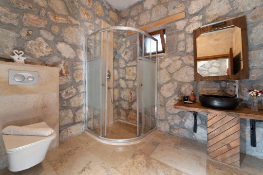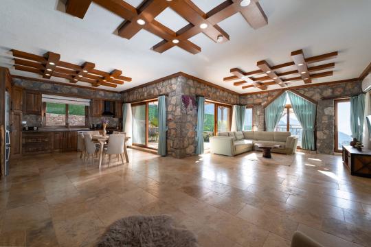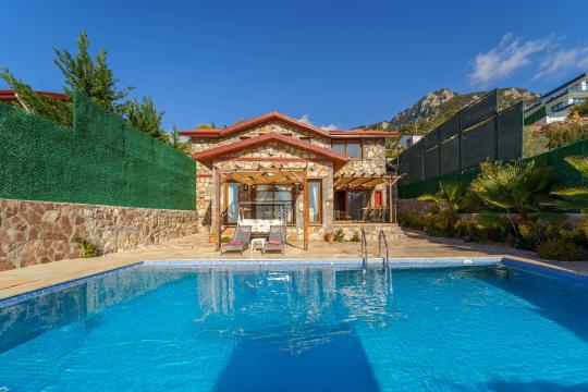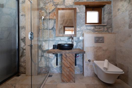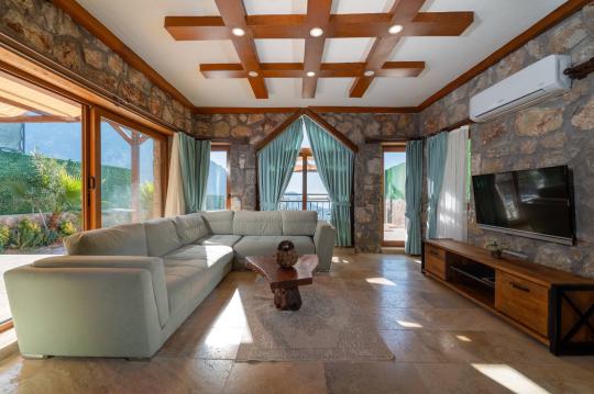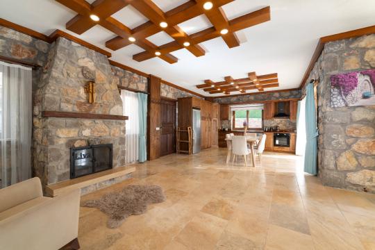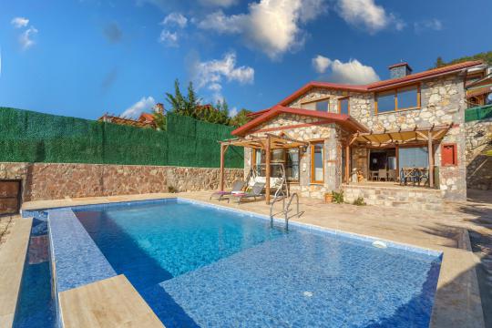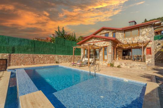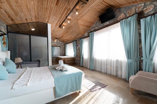 Taş ve ahşap detayların ön planda tutulduğu modern mimariye sahip olan villamızda 2 adet yatak odası ve 2 adet WC-Duş bulunmaktadır. Birinci yatak odasında 1 adet çift kişilik yatak, jakuzi, ebeveyn banyosu, klima ve TV bulunurken, ikinci yatak odasında 2 adet tek kişilik yatak yer almaktadır. Ortak alanda açık mutfak-salon, WC-Duş, klima ve TV bulunmaktadır.